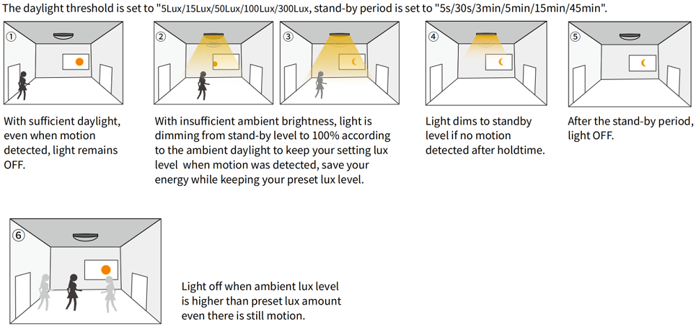 Le MC004-S02R a été construit en mode double photo. Technologie de capteur pour distinguer la lumière naturelle et la lumière artificielle LED, de sorte que le capteur atténuera dynamiquement votre luminaire en fonction de la lumière du soleil ambiante. Lorsqu'un mouvement est détecté, lorsque la lumière du soleil augmente, le luminaire s'assombrit. Lorsque la lumière du soleil baisse, le luminaire est allumé. Ce mécanisme pour équilibrer la lumière naturelle et la lumière artificielle économise votre énergie, mais maintient le niveau de lux nécessaire.