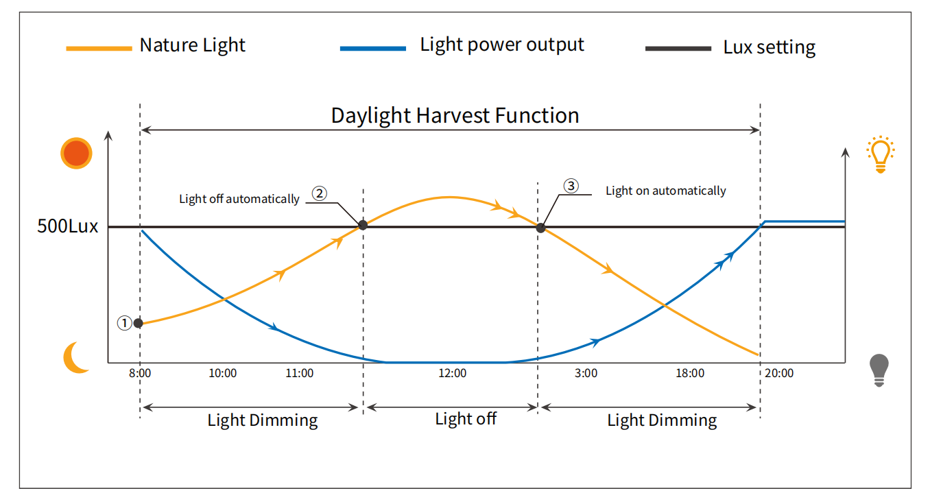 1. Détection de mouvement + récolte de lumière du jour + fonction marche/arrêt Lux